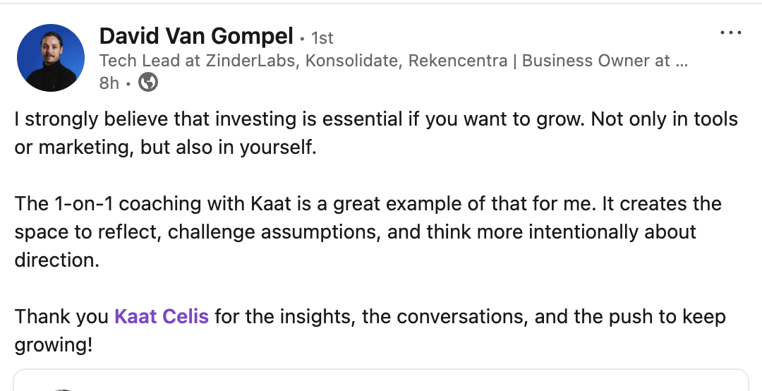 Between sessions you can reach me through WhatsApp coaching during business hours, so questions or decisions never have to wait until the next meeting.